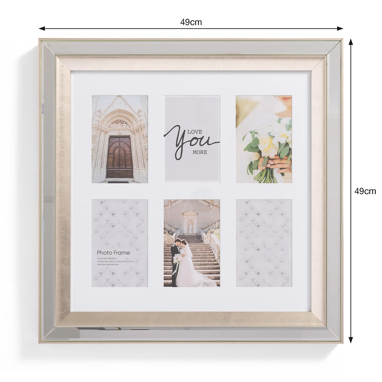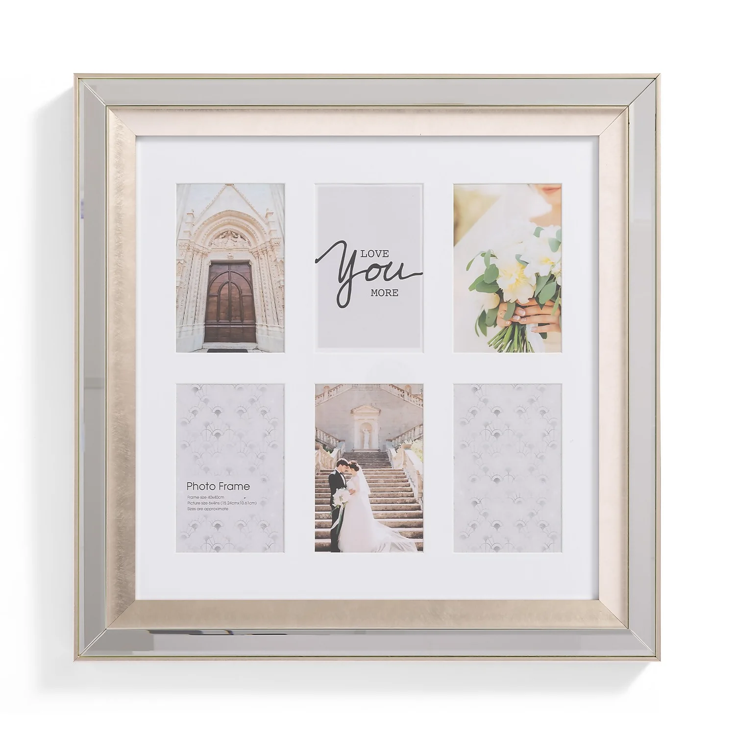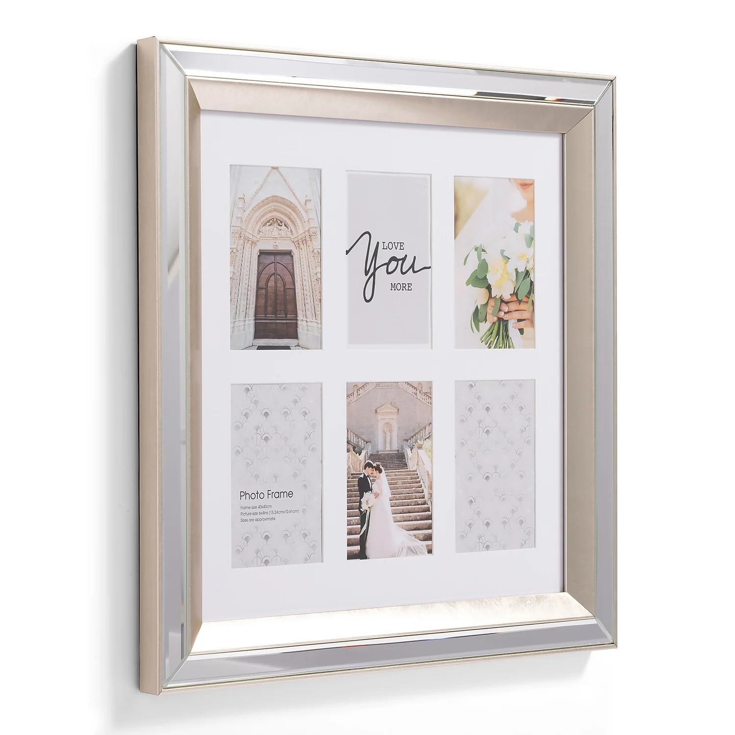 This multi aperture frame features an elegant mirror frame. The perfect frame to store your most treasured memories.