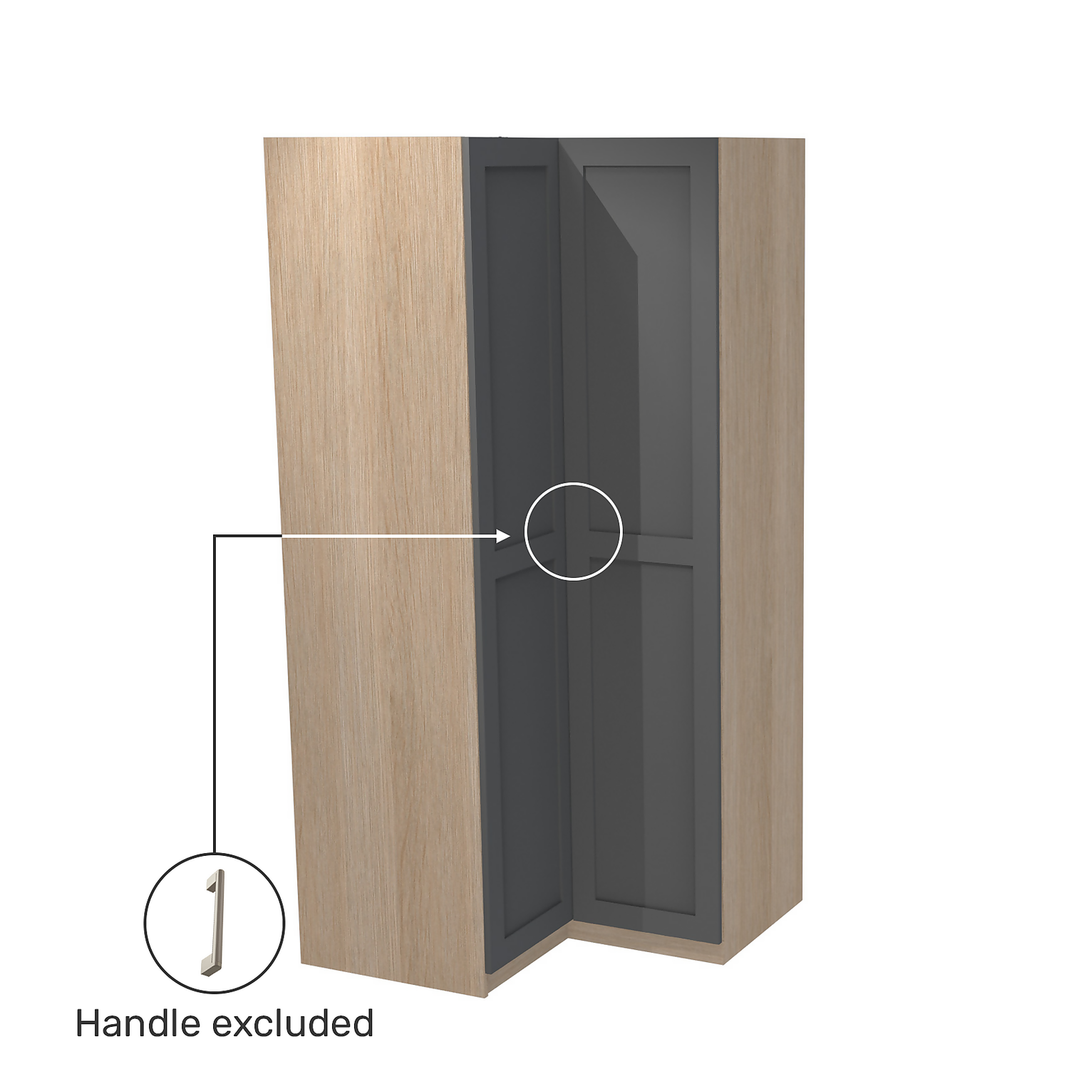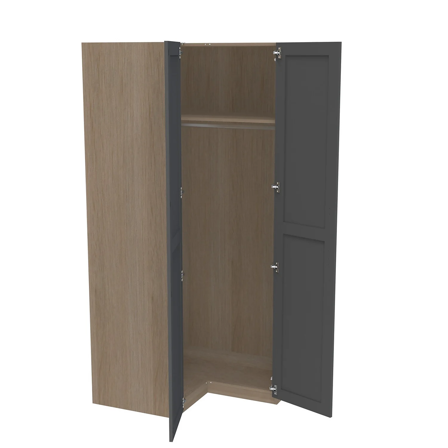 The House Beautiful range is exclusive to Homebase and offers a selection of different finishes and storage configurations to suit your needs. With a range of carcass colours and contrasting door designs, you can select the look to fit your bedroom aesthetic. This corner wardrobe (1 x double unit and corner conversion) features an oak effect carcass and beautiful shaker doors finished in a luxurious matt carbon grey. The wardrobe features premium soft close clip-on Blum hinges, five shelves and a hanging rail. You can customise your wardrobe with our additional internal storage options (available separately) including internal drawers, shelves, dividing shelves and extra hanging rails. Choose your handles from our range of both traditional and modern to suit your desired look.