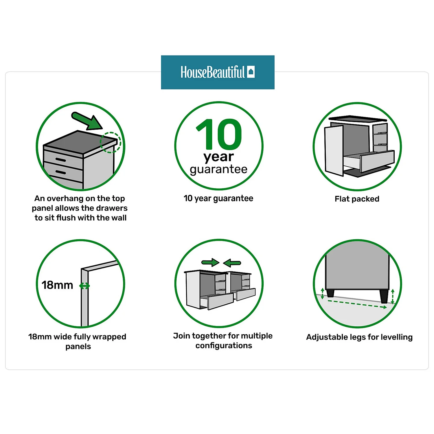 The House Beautiful bedroom range available exclusively at Homebase is full of great ideas and designs for your home. This three drawer chest has been finished in a luxurious matt white and features colour-matched carcass and drawer fronts, fully wrapped panels, soft-close clip-on Blum runners and an internal drawer box finished in a textured linen effect.