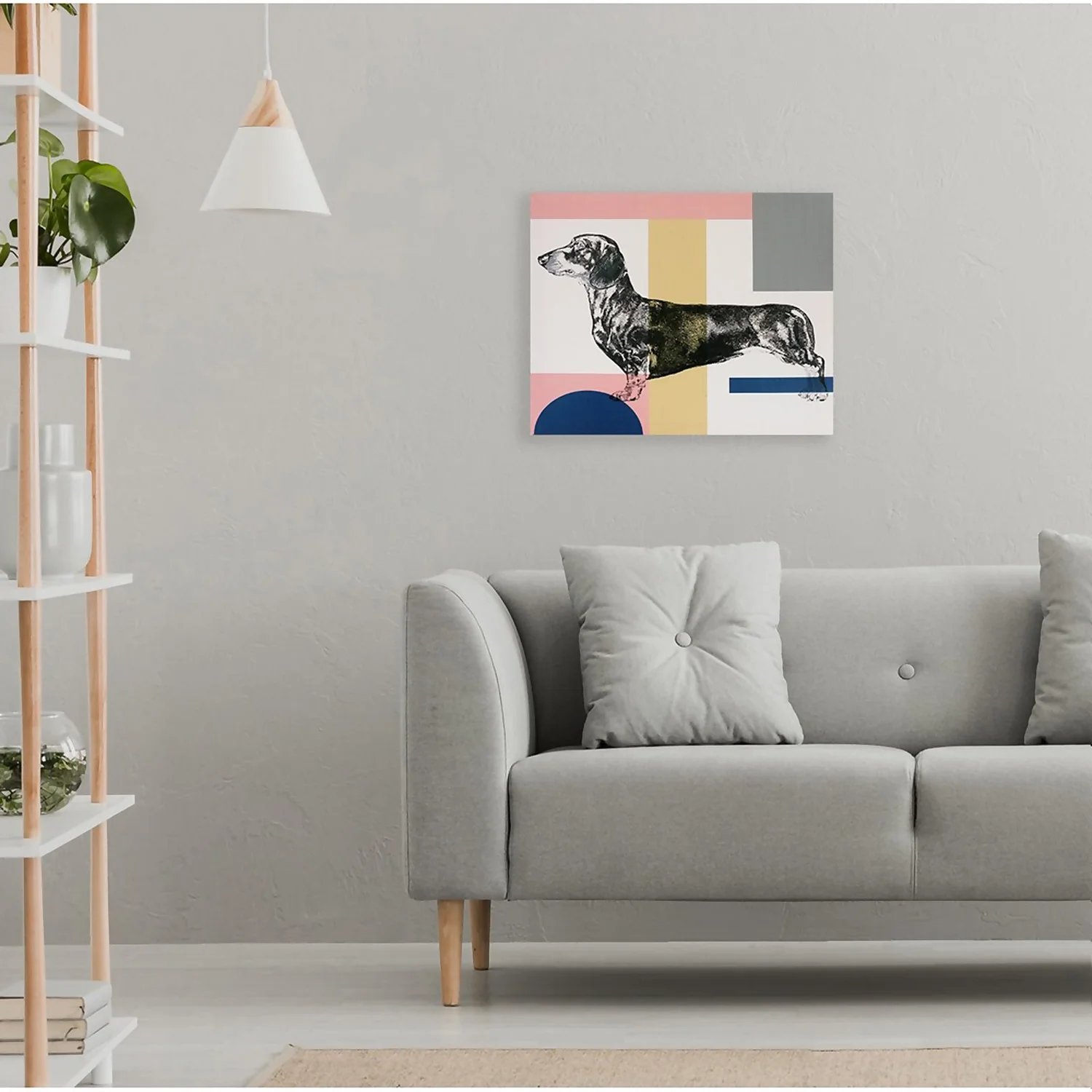 Here is the perfect canvas for all those Dachshund lovers! This colourful piece of wall art features a detailed drawing of a Sausage dog in black that sits on a geometric background with a retro vibe.